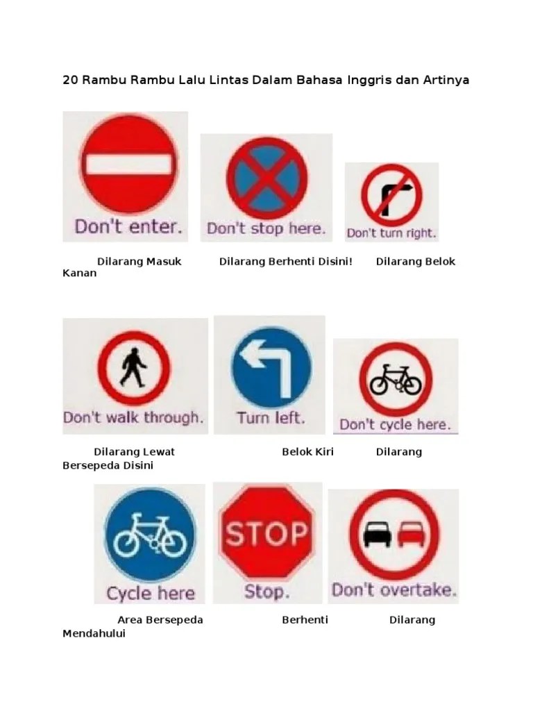Jalan candi 25 malang 65154 mr. Dialog bahasa inggris tentang berkendara dan rambu lalu lintas lengkap dengan arti dan pembahasan materi. Dengan demikian, rambu lalu lintas berarti pemberitahuan untuk menaati aturan lalu lintas. Apakah sahabat kbi telah memahaminya? Pengertian rambu menurut kamus besar bahasa indonesia berarti tanda atau semboyan. Ini dia kosakata bahasa inggris tentang liburan beserta contoh kalimat dan terjemahannya. Bab.la tidak bertanggung jawab atas isinya. Belajar dasar bahasa inggris 50 rambu rambu lalu lintas dalam bahasa inggris dan artinya rambu rambu lalu lintas adalah sebuah tanda yang berfungsi untuk menyampaikan sebuah larangan himbauan perhatian peringatan atau pesan pesan lainnya. Gambar rambu rambu lalu lintas dilarang masuk sketsa memang saat ini sedang banyak dicari oleh pengguna disekitar kita, salah satunya anda. Ketika sedang berkendara di jalan pasti sahabat kbi sering melihat rambu rambu lalu lintas, dari mulai tanda dilarang parkir, dilarang berhenti, dilarang belok dan lain sebagainya. Hal ini ada karena sudah diatur oleh peraturan menteri perhubungan nomor tiga belas tahun 2014. Jika dulu tempat tinggal dijadikan untuk tempat perlindungan dari perubahan cuaca serta untuk melindungi diri. Jakarta utara baby angeline shop.